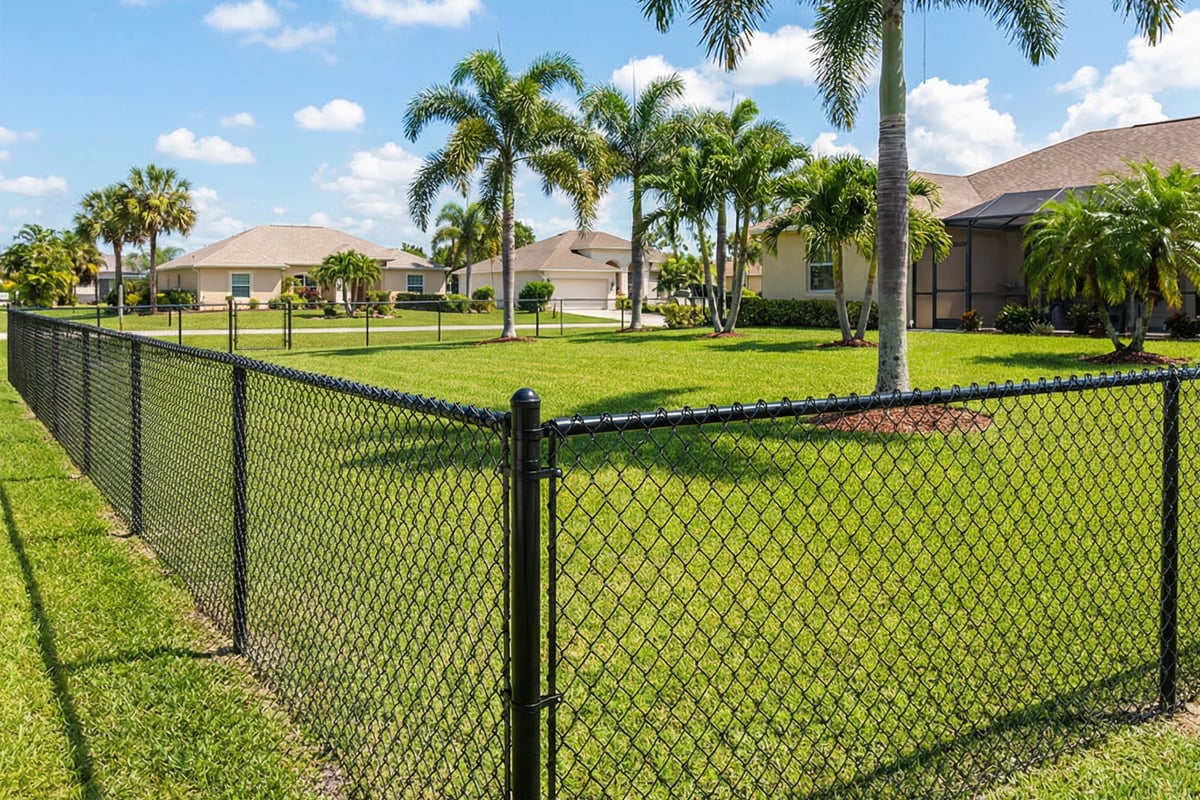 Galvanized or vinyl-coated — your choice. Standard galvanized chain link has a zinc coating that fights corrosion and is the toughest, most economical option. Vinyl-coated adds a PVC layer over the galvanized wire in black, green, or brown — it blends into Tampa Bay landscaping better and satisfies HOA guidelines that prohibit bare galvanized. Both options are durable in Florida’s humidity and salt air.